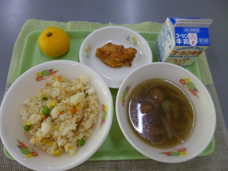 牛乳 ガーリックライス 鶏の唐揚げ 肉団子と野菜のコンソメスープ みかん