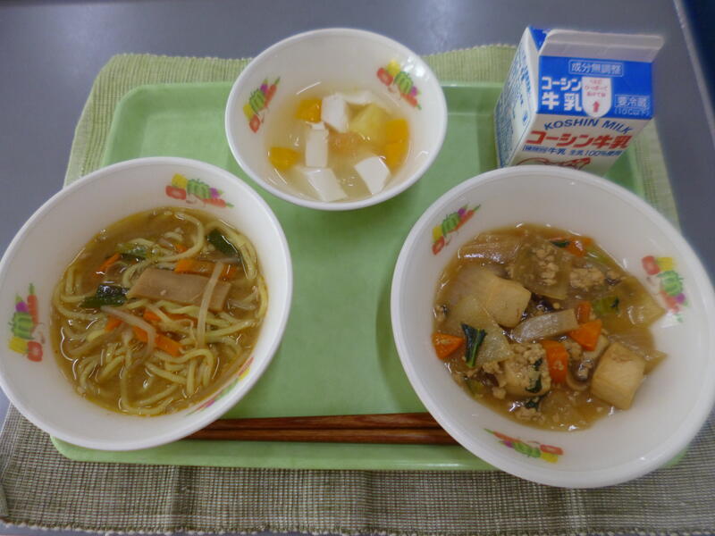 牛乳 みそラーメン 生揚げの中華煮 フルーツと豆乳のデザート