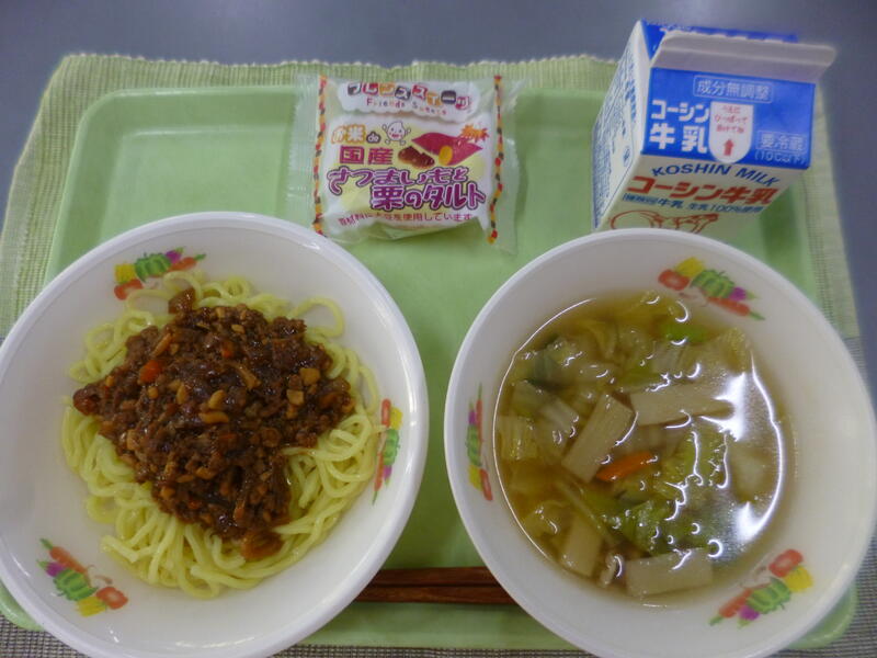 牛乳 ジャージャー麺 五目スープ さつまいもと栗のタルト