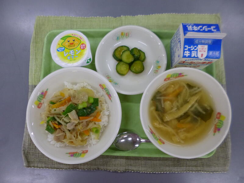 牛乳 ねぎ塩豚丼 きゅうりのピリ辛漬け 切り干し大根のみそ汁 はちみつレモンゼリー