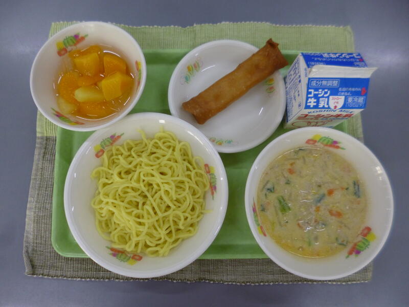 牛乳 豆乳たんたんつけめん 春巻き フルーツ和え