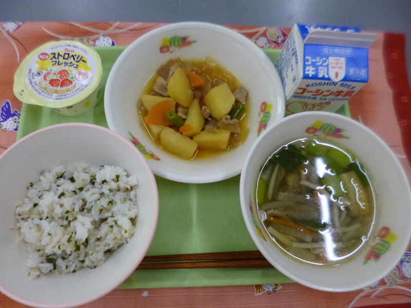 牛乳 わかめごはん 肉じゃが 沢煮椀 いちごゼリー