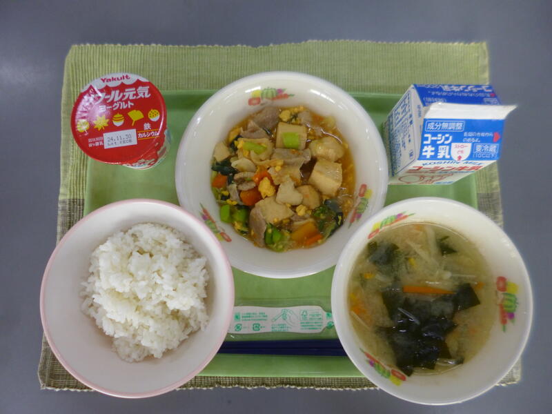 牛乳 ご飯 小松菜のチャンプルー 切り干し大根の味噌汁 ヨーグルト