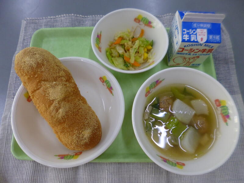 牛乳 きなこ揚げパン アーモンドサラダ ミートボールと野菜のスープ
