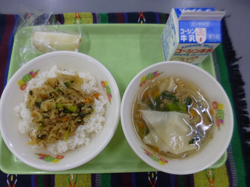 牛乳 ツナの和風スパゲティ 鶏野菜スープ パインクレープ