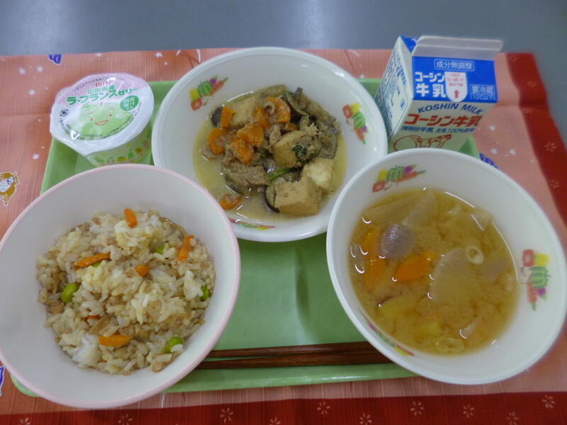 牛乳 こぎつねごはん なすと厚揚げのごま煮 さつまいものみそ汁 ラ・フランスゼリー