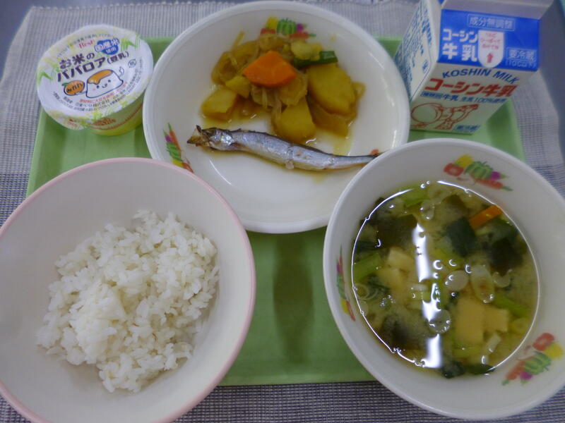 牛乳 ごはん やきししゃも カレー肉じゃが 小松菜と豆腐のみそ汁 お米のババロア