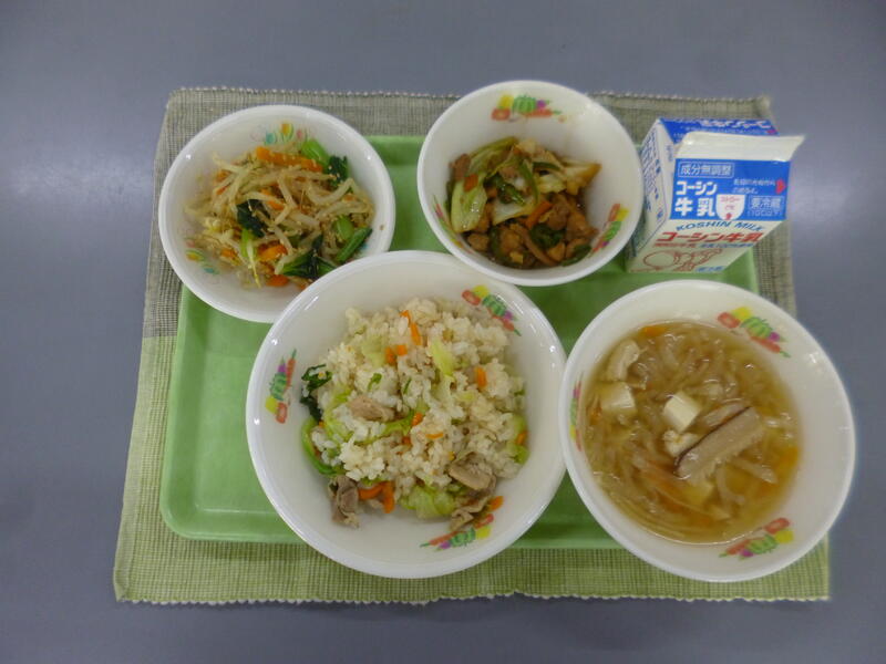 牛乳 根菜のきんぴらご飯 イカのカリン揚げ 青菜の味噌汁 グミ