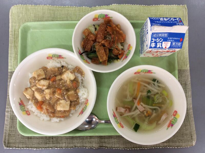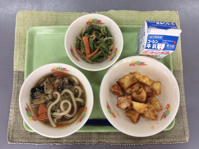 牛乳 けんちんうどん 味噌ポテト いんげんの胡麻和え