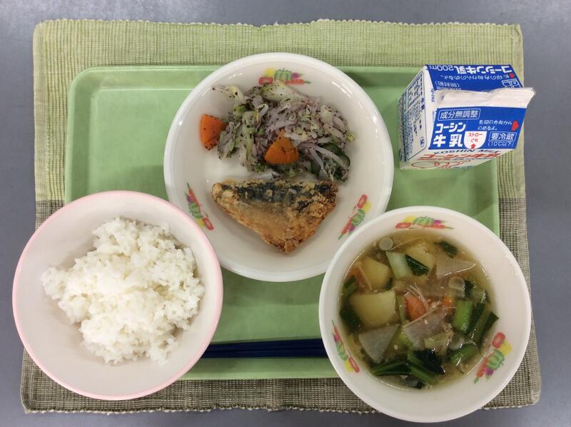 牛乳 ご飯 鯖の唐揚げ ゆかり和え じゃがいものそぼろ汁