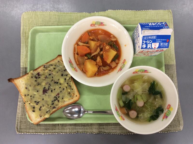 牛乳 みりんスイートポテトトースト 野菜のトマト煮 キャベツとウインナーのスープ