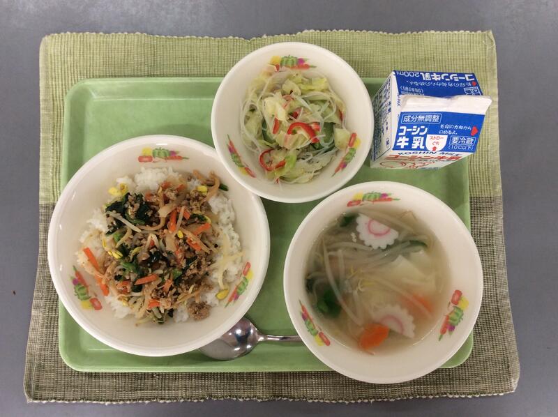 牛乳 ビビンバ 中華サラダ ワンタンスープ