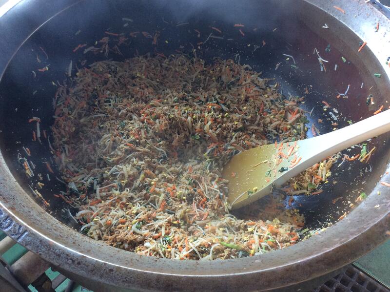 ビビンバは、ご飯の上に甘辛く味付けした肉と野菜をのせて食べます。「ビビン」は混ぜる、「バ」はご飯を意味しています。