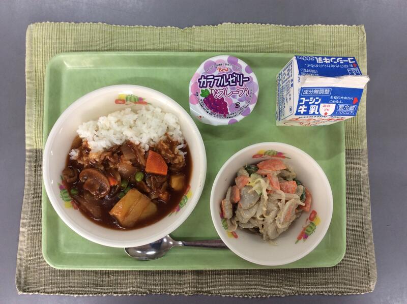 牛乳 ハヤシライス ごぼうサラダ グレープゼリー