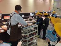 見学は、2班に分かれて行います。バックヤードと店内を交代で見学しました。お惣菜の加工、値引きシールをはる作業、レジ打ちの作業、食品の保管や加工など、細かいところも丁寧に見せてくださいました。