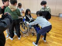 11月11日(火)に、4年生が高齢者体験を行いました。4年生は、総合的な学習の時間に「広げよう心のバリアフリー」を学んでいます。高齢者体験キットを用いて、車いすに乗ったり、新聞を読んだりしました。