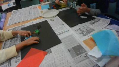 やっているうちに、「ぺたーっと貼ってしまうより、少しまるめて紙をしわしわにしてからの方が貼った時におもしろい」ということに気づく子どもたちもいました。