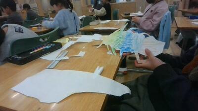 次に、こすりだした生きものを画用紙に切り貼りしています。
