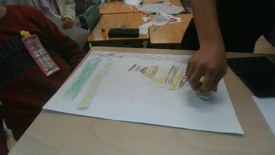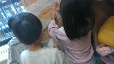 今回は、スイミーを元気づけるすばらしいものを、自分たちで考えてみることにしました!また、それを絵にする活動の中で、まずはこすりだしをしています。壁や床、階段のすべり止めなど、生きものの質感に合った凹凸を選んでいました。