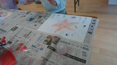 その後、ペットボトルのキャップやプラスチック容器、洗濯ばさみに絵の具をつけ、スタンプのように跡をつけました。海の水模様や、海藻の様子を、様々な色合いで表していました!
