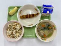 ご飯にたくさんじゃこが入っていて、カリッとした食感もあるわかめじゃこご飯でした。たくさんのじゃこが入っているので、カルシウムもたくさん摂取できました。揚げ鶏とじゃがいもの煮物は、とてもジューシーな鶏肉とやわらかなじゃがいもの相性が抜群な味わいでした。鰹のだしが効いていて、具だくさんのすまし汁でした。(文責:教頭)
