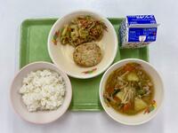 牛乳 ごはん 豆腐ハンバーグ みりんマスタードソース ツナとキャベツの和え物 じゃがいものそぼろ汁