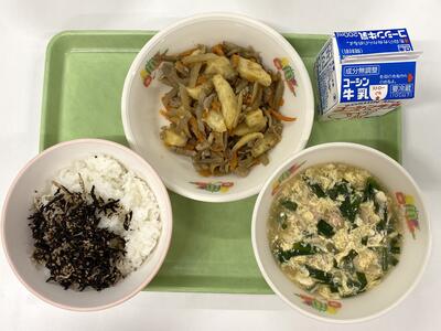牛乳 ごはん ひじきのふりかけ 揚げじゃがいもの炒め煮 にら玉汁