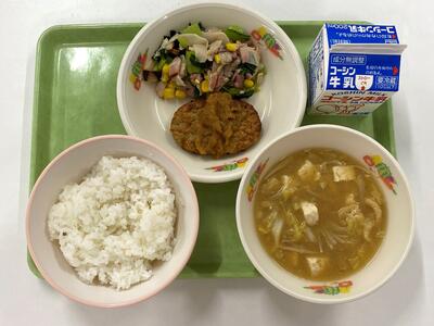 牛乳 ごはん ハンバーグおろしソース 小松菜とエリンギのソテー 白菜のみそ汁