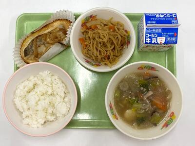 牛乳 ごはん たらのみそマヨネーズ焼き 切干大根の煮物 いももち汁