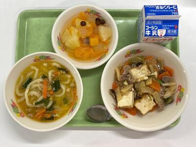 牛乳 ごま坦々うどん 厚揚げのオイスターソース炒め フルーツみつ豆