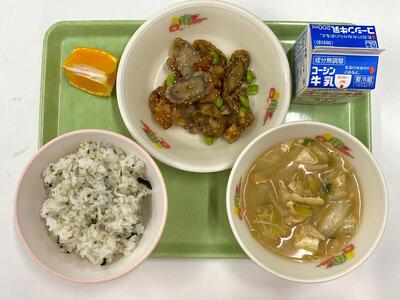 牛乳 わかめじゃこごはん チキンチキンごぼう 白菜と油揚げのみそ汁 デコポン