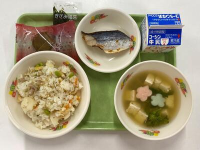 五目そぼろは、豚肉・大豆・にんじん・しいたけ・わけねぎが入った具だくさんごはんです。苦手な人の多い大豆も混ぜ込んでしまえば食べられたのではないでしょうか。