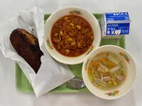 牛乳 ピュアココア揚げパン チリコンカン 白菜とベーコンのスープ