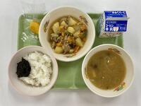 牛乳 ごはん のり佃煮 肉じゃが なめこのみそ汁 柿