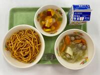 焼肉チャーハンは、豚肉に、しょうゆ・砂糖・にんにく・しょうが・ごま油などをよくもみ込んで下味をつけてからいためました。「焼肉」をうたうからにはと、普段の混ぜごはんよりもお肉を少し多めに使っているので、子どもたちからも「お肉のごはんおいしかった!」という感想が聞こえてきました。また、表面をカリッと揚げたさつまいもは、大学いもとは少し味を変えて、オイスターソースを加えた甘辛味です。さつまいもが好きな子はどのクラスにも多く、すぐに食缶が空っぽになりました。