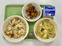 牛乳 焼肉チャーハン さつまいもの甘辛あえ 中華卵コーンスープ