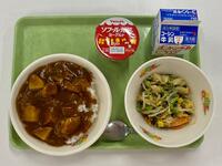 みんな大好きカレーライスの日! 豚肉はしっかりと大きさのある角切り肉を入れているので、食べ応えもばっちりです。合わせるサラダは、カレーの風味に負けないよう、ねりごまとすりごまを加えて濃厚な味つけにしています。