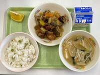 牛乳 グリンピースごはん かつおと野菜の甘酢炒め 厚揚げのみそ汁 甘夏