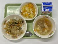 今日はもちもちの中華風おこわです。うるち米ともち米を2:1で合わせ、具材には豚肉・にんじん・山菜・大豆もやしを使っています。子どもたちは「もち米って何?」と聞いてきた子もいましたが、いつものごはんとの食感のちがいを感じて食べてくれていたらうれしいです。コーンスープは、粒のままのホールコーンとひいた状態のクリームコーンの両方を使っているので、トウモロコシの甘味が感じられるスープです。