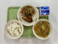 今が旬のさつまいも・きのこ・れんこんを使った秋の味覚の献立です。混ぜごはんは、しょうゆを入れて炊いたごはんに鶏肉・さつまいも・しめじ・わけねぎを混ぜ込みました。しょうゆ味の茶色い混ぜごはんは普段あまり食べ慣れていないのか、どうしても苦手とする子の多いメニューのひとつです。今日も苦戦しつつ挑戦している姿が見られましたが、学校給食を通して、和食特有の味つけに接する機会を増やしていって欲しいと感じています。れんこんのきんぴらは、ほんの少しの一味唐辛子を加えたピリ辛の味つけです。れんこんはほどよく火を通してシャキシャキの食感を残しています。