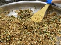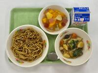 今日は甘めに味つけした肉みそをたっぷりと混ぜ合わせた焼きそばです。しっかりと量があるため、残ってしまうかな?と心配もしましたが、担任のおかわりの号令に、列を作ってくれたクラスがたくさんありました。じゃがいもの煮物は汁気が少なくなるように煮たところに、とろみをつけて、食材に味がよくからむように作っています。