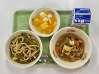 牛乳 カレーうどん 厚揚げのそぼろ煮 フルーツ白玉