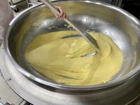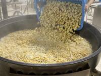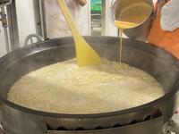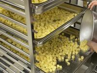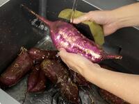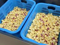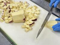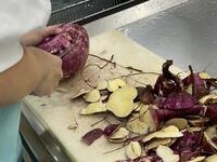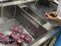 おおぐろの森小学校分の約940食で30kgのさつまいもを使用しました。掘って乾かした状態のさつまいもにはまだ泥がついているので、スポンジでこすり洗いをするところからのスタートです。そのあと、ツルの残りやヒゲを切り落とし、シンクを3回移し替えながらよく洗います。きれいになったさつまいもは2cm程度の角切りにして、水にさらし、釜に加えて加熱したら完成です。今年のおいもも、しっとりホクホクで、甘みがあり、とてもおいしいさつまいもでした。秋の豊かな実りを、全校みんなで味わうことができました。