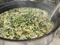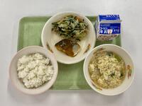 今日のお魚は、「さば」です。脂ののったノルウェーさばを焼き、みそ・砂糖・しょうゆ・ねりごまなどで作ったタレをかけています。みそダレはこってりと濃厚な味にして、ごはんの進む味つけです。かきたま汁は、昆布とかつお節の合わせ出汁を使っています。鶏卵は、給食室で1個1個を手で割り、よく溶きほぐし、沸騰した汁に細く細く流し入れていくことで、ふわふわのかき玉の出来上がりです。