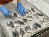 今日のお魚は、「かつお」です。赤身の魚で、ぎゅっとしまった身質をしています。臭みを感じることもある魚ですが、今日の納品されたかつおはそのようなこともなく、おいしく食べることができました。タレは、砂糖じょうゆにたっぷりのすりごまとすりおろしたしょうがを加えています。白いごはんが進むように、少し濃いめの味つけです。和え物は、かつお節を使ったおかか和えです。かつお節にはうまみ成分がたくさん含まれているため、おいしいだけでなく減塩にもなってくれるうれしい食材です。