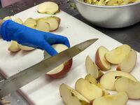 今日のカレーはチキンカレーです! 大きな口でもりもりと食べ進め、お皿も食缶もあっという間に空っぽになるクラスがたくさんありました。デザートのりんごは、フジという品種です。給食室で1/8に切り分けて、1切ずつ芯を取り、塩水につけて変色を防ぎます。みつは入っていませんが、甘くてみずみずしく、シャクシャクとした心地よい食感のあるりんごでした。教室ではおかわりをめぐるジャンケンが繰り広げられていました。