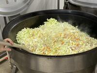 今日のメニューは、野菜たっぷりの焼きうどんです。豚肉のほかに、キャベツ・にんじん・玉ねぎなどのたくさんの野菜を使っています。いためた具材に、しょうゆ・コンソメ・塩・こしょうで味をつけて、ゆでたうどんと合わせます。うどんの重量は、くろもり小全員分で90kg。大量の焼きうどんが出来上がりましたが、どのクラスも「おいしい!」と食べていて、食缶が空になるクラスばかりでした。米粉のケーキは、パインとりんごの缶詰が入っています。フルーツポンチで食べるのも人気ですが、温めてもトロッとしておいしく食べられます。