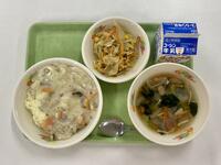 牛乳 ごはん ちくわのカレー揚げ 切干大根の煮物 いももち汁