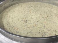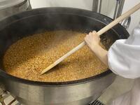 今日のごはんにはホワイトソースをかけるので、ほんのりと黄色をしたターメリックライスをたきました。ターメリックは、和名だとウコンというスパイスで、特有の香りがありますが、子どもたちが食べにくさを感じないようにわずかな量だけ入れるようにしています。ホワイトソースは、バターと小麦粉でホワイトルウを作って、ごはんにかけたときに染み込みすぎないための固さを出しています。
