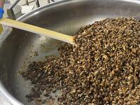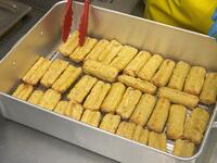 今日のちくわはカレー風味の味つけです。お魚は苦手でもちくわは食べられるという子も多く、加えて食べやすいカレー味のため、「どれがおいしかった?」と聞くと、「ちくわ!」と答える子がたくさんいました。切干大根の煮物は、よく味を含めながらじっくりと炒め煮にしていきました。ごはんのおかずになるように、よくうま味の出る鶏肉やさつま揚げを入れ、ちょっと濃い目の味つけにしています。